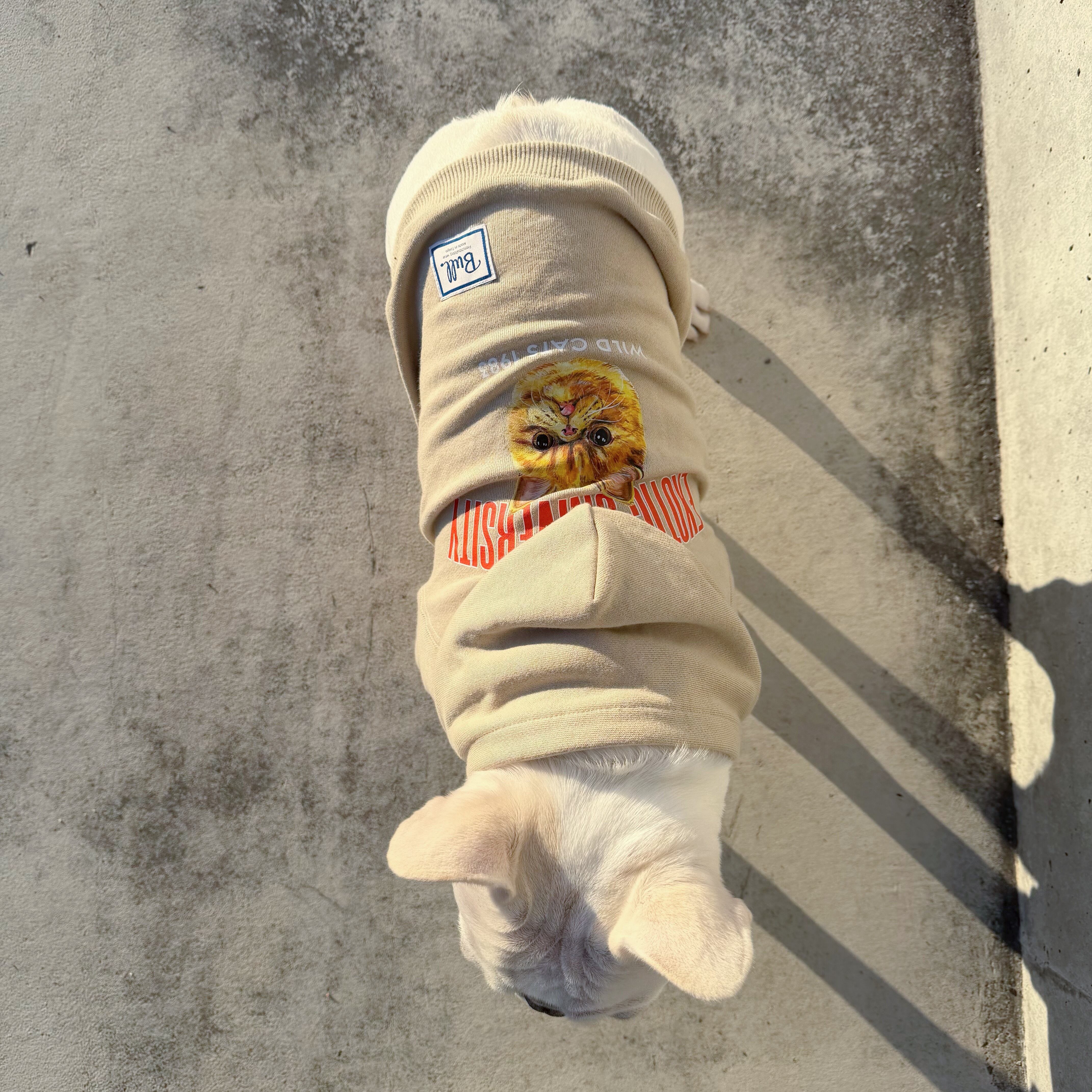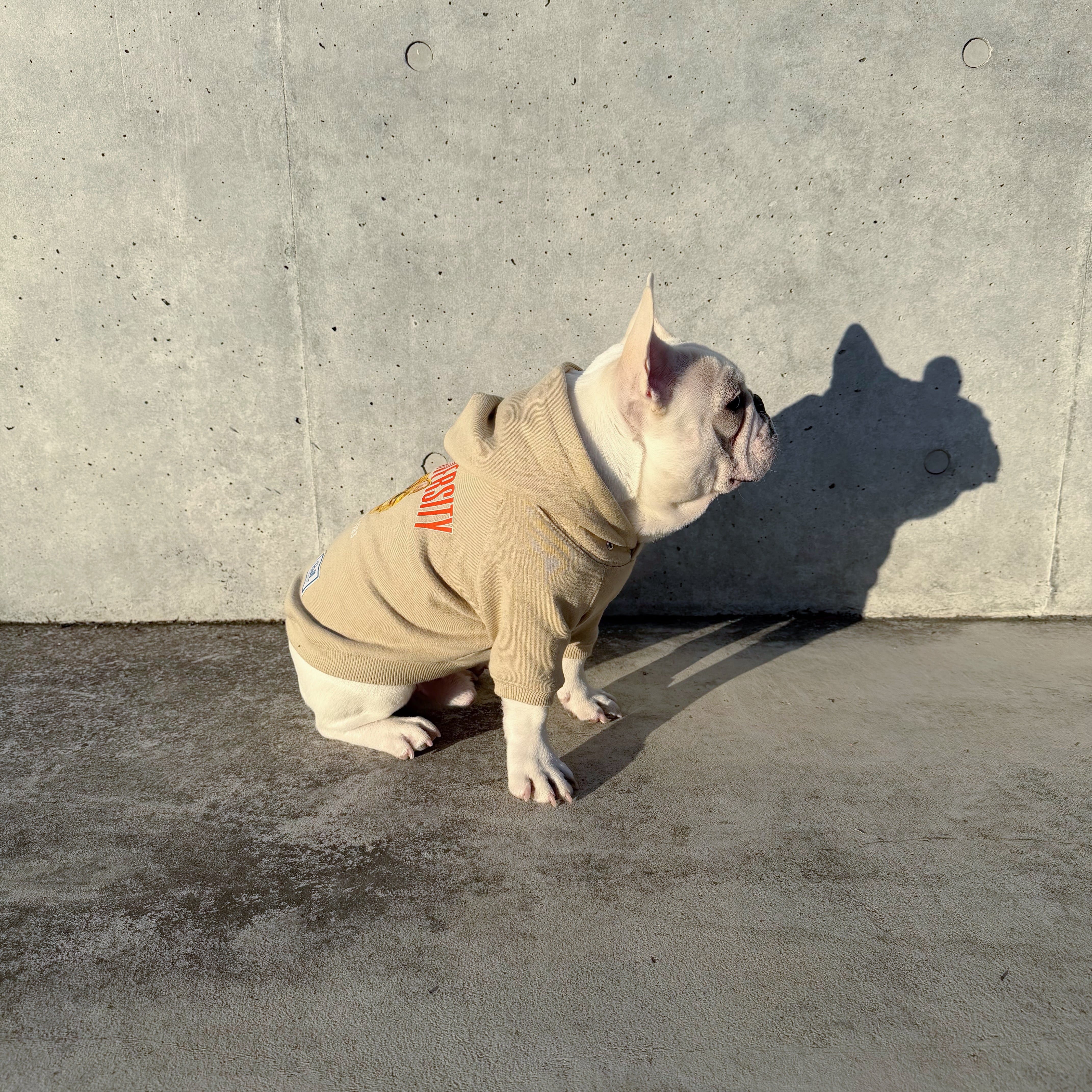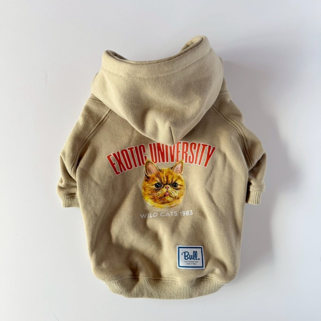 海外大学の売店で販売されているパーカーをアレンジして同じ鼻ぺちゃ族のエキゾチックショートヘアをマスコットにしたプリントを施したパーカーです。