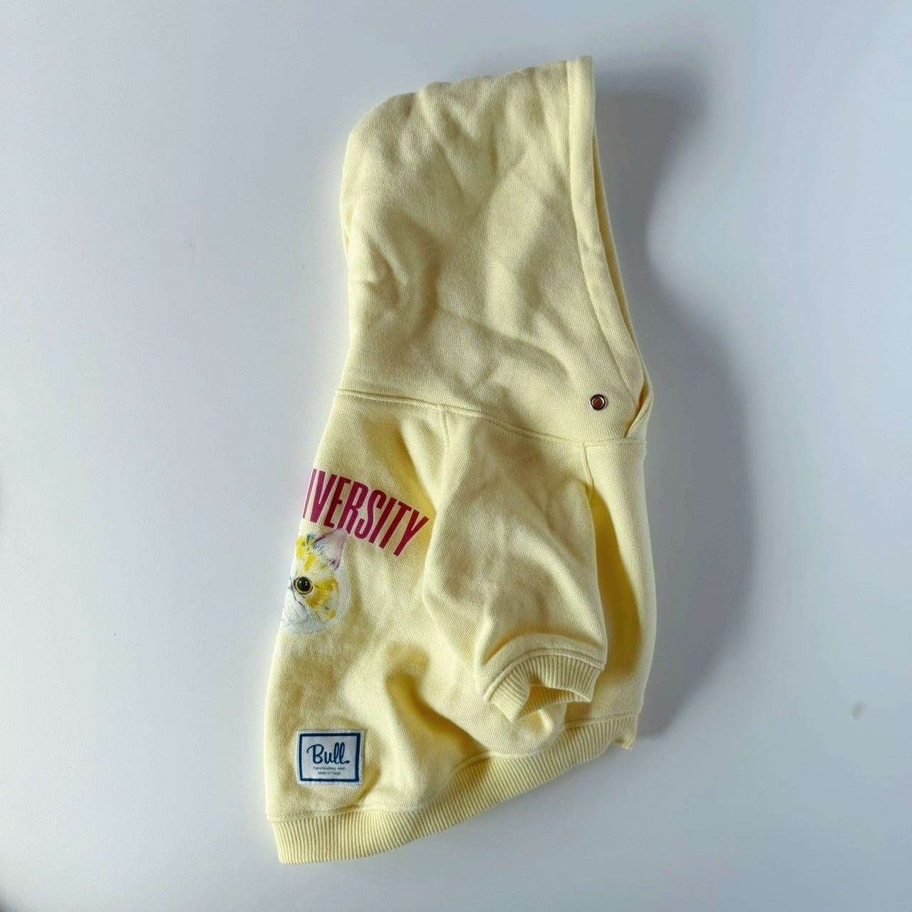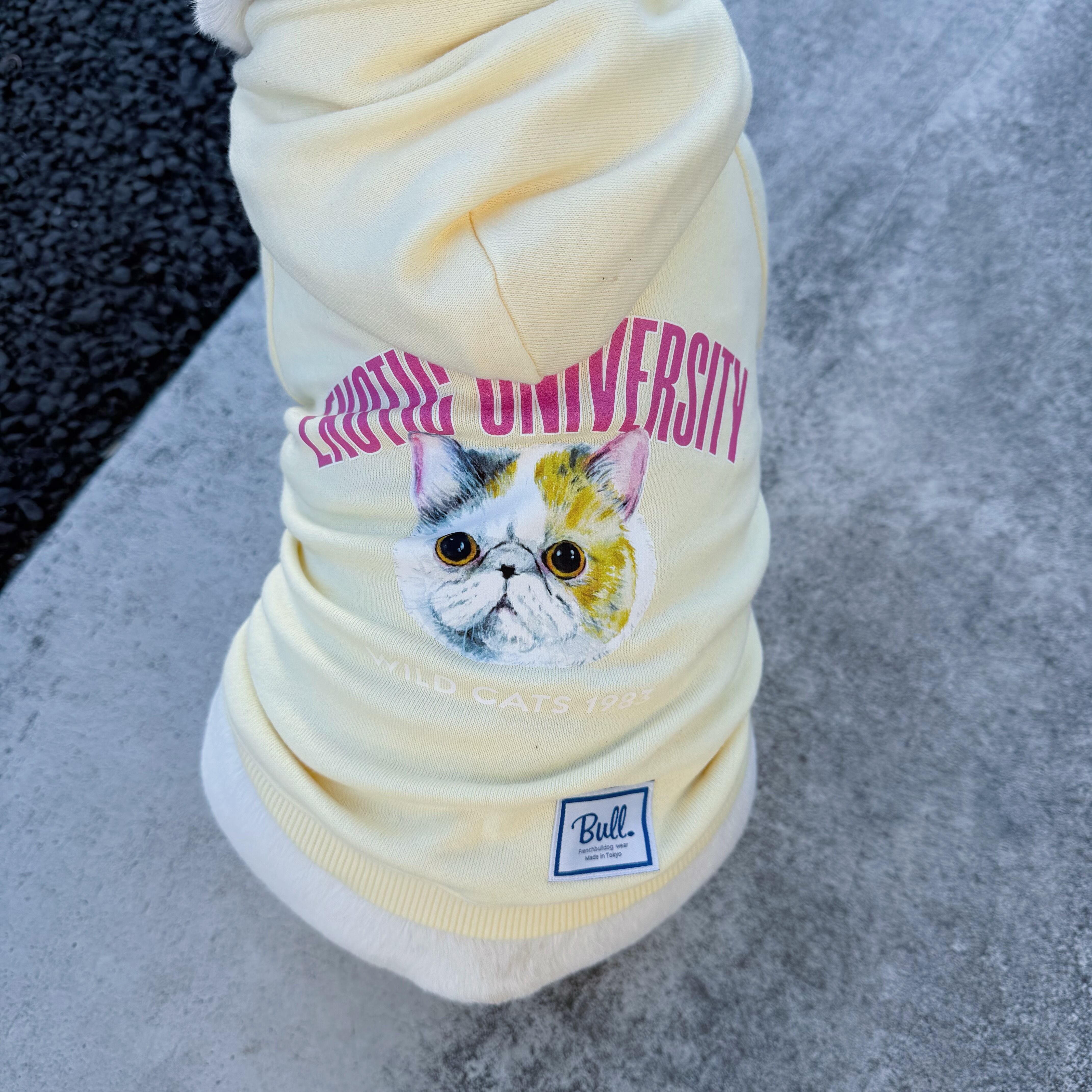 海外大学の売店で販売されているパーカーをアレンジして同じ鼻ぺちゃ族のエキゾチックショートヘアをマスコットにしたプリントを施したパーカーです。